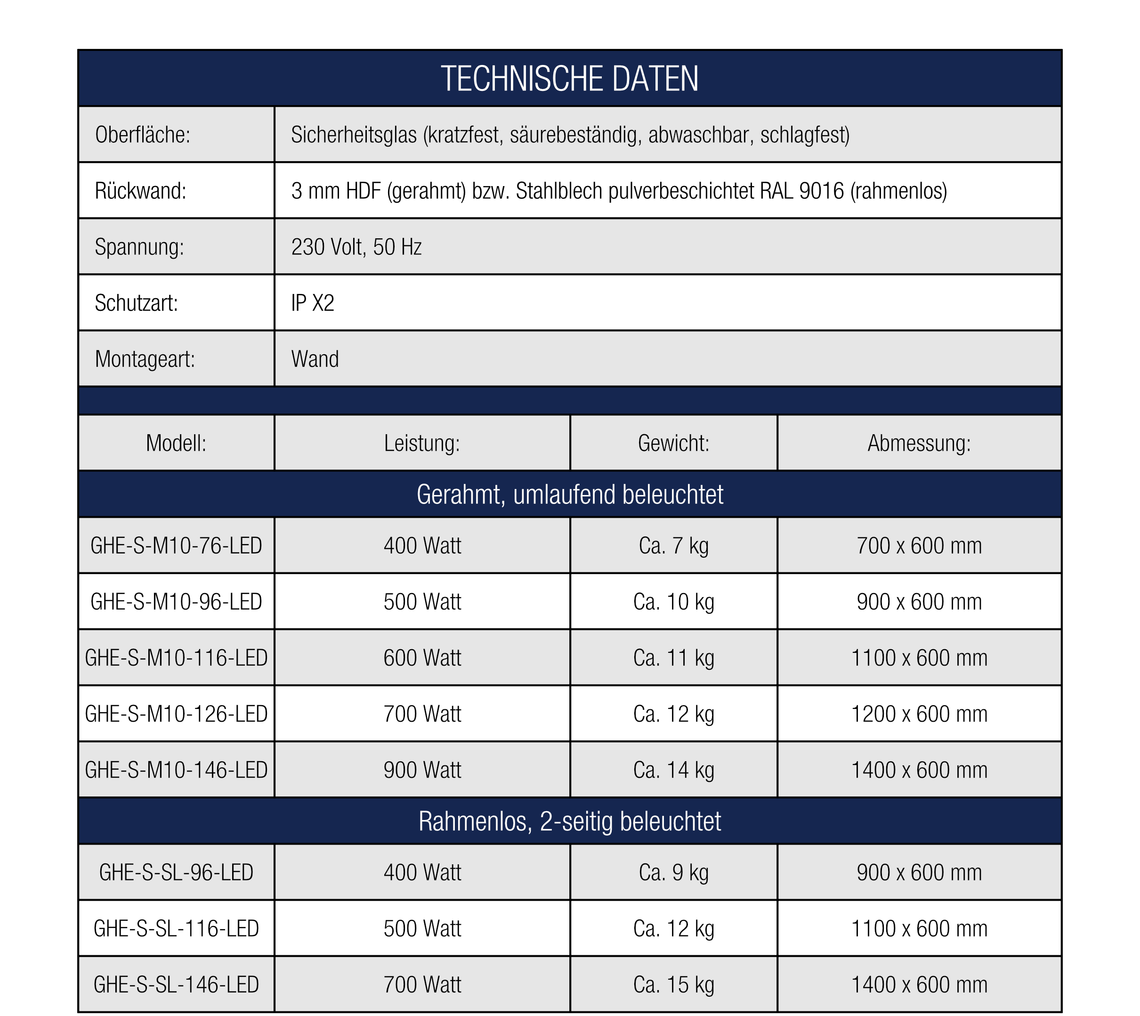 Ein optisches Highlight sind unsere Spiegelheizungen der LED-Line. Ob als umlaufende Direktbeleuchtung oder seitlicher Beleuchtung mit Ambientelicht, setzen Sie angenehm warme Lichtakzente in jeder Umgebung. Für höchstmögliche Flexibilität in der Steuerung sind Heizung und Beleuchtung getrennt voneinander regelbar.