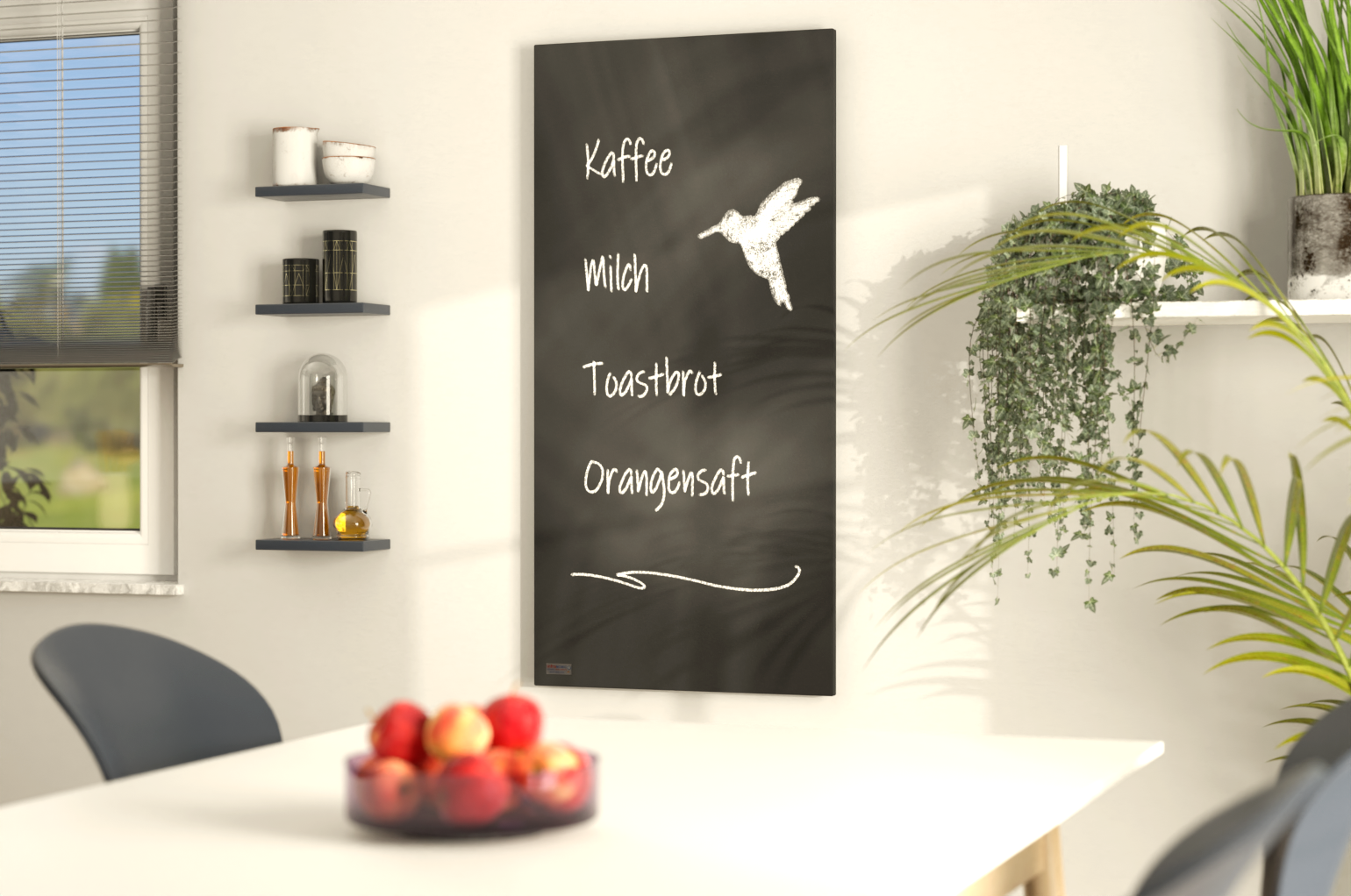 STEEL-LINE bedeutet nicht nur klassisch weiß. Eine beliebte Variante ist die schwarz emaillierte Tafelheizung, die mit Kreide beschrieben werden kann. Auch Pulverbeschichtungen in anderen Farben sind auf Anfrage möglich.